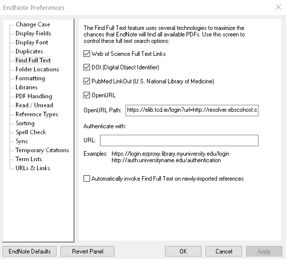 Open Preferences. On Windows, this is under Edit; on Macs, under EndNote X9, EndNote 20 etc.. Navigate to Find Full Text and paste the code below into OpenURL Path. making sure the four boxes at the top are ticked. Then click OK to save and close.