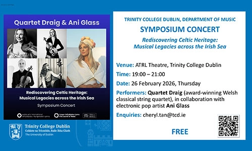 This concert, part of the Music Symposium ‘Rediscovering Celtic Heritage: Musical Legacies across the Irish Sea, is on Thursday 26 February 2026 at 19.00 in the ATRL Theatre, TCD. Admission is free and all welcome.