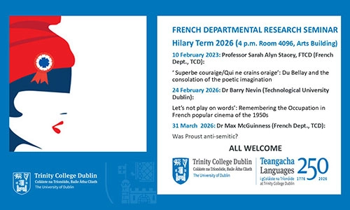 There are three seminars in this series and they take place on 10 February 2026; 24 February 2026; and 31 March 2026, at 16.00 in Room 4096, French Departmental Library, Arts Building, TCD.