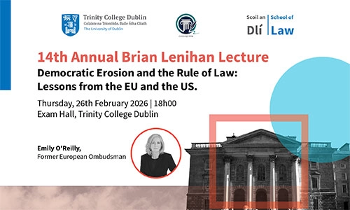 This year’s lecture ‘Democratic Erosion and the Rule of Law: Lessons from the EU and the US will be delivered by Emily O’Reilly, former European Ombudsman on Thursday 26 February 2026 at 18.00 in the Examination Hall, TCD.