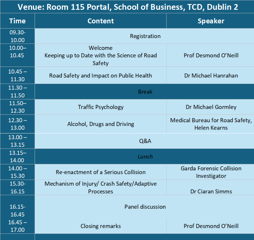 The modules will be delivered by Irish and international experts in the areas of road safety, engineering, occupational therapy, psychology and medicine. An outline of the module content is set out below.