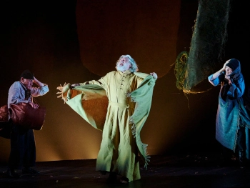 King Lear (Conleth Hill), the Fool (Michael Glenn Murphy) and Curan (Fiona Bell) battle the storm in a Gate Theatre 2025 production of King Lear, Photo by Ros Kavanagh