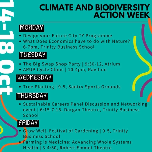 Trinity College Dublin will host Climate and Biodiversity Week from October 14th to 18th, featuring events aimed at promoting sustainability and environmental action.