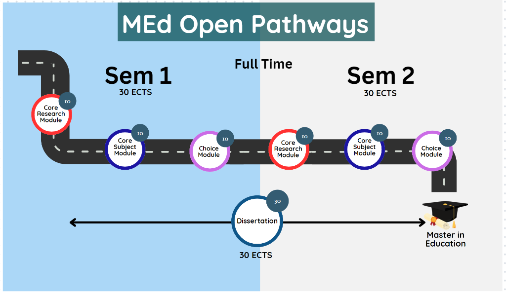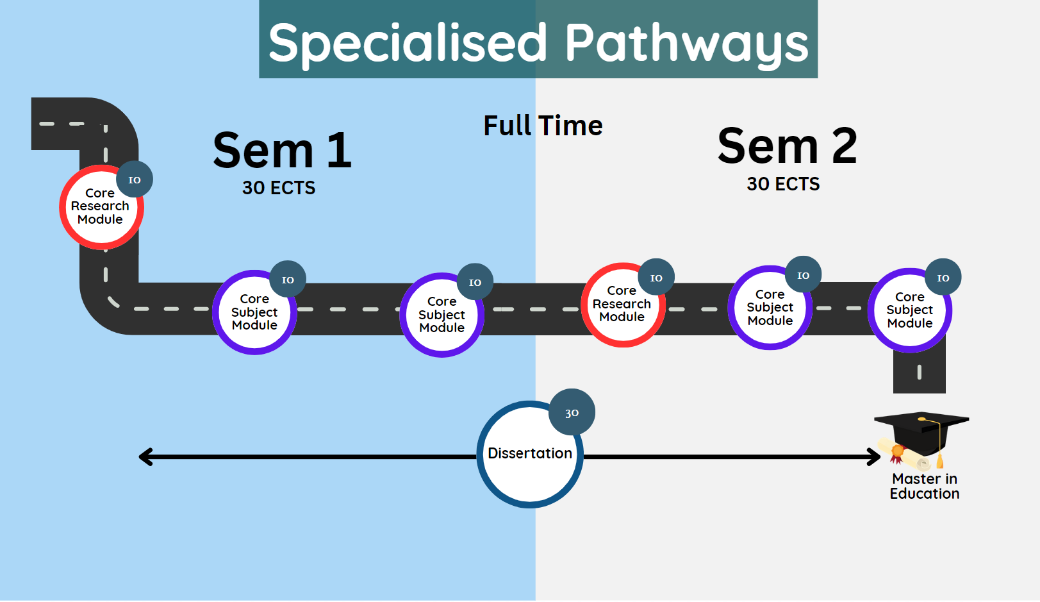 It comprises four specialised pathways options (Drama in Education, Higher Education, Leadership and Policy, Psychology of Education and one flexible open pathways option (Open Pathways) that allow students to gain a comprehensive and contemporary understanding in one of the specialisms offered.