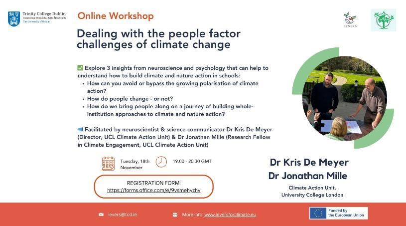 Facilitated by our LEVERS colleagues Dr Kris De Meyer and Dr Jonathan Mille from the Climate Action Unit, University College London, this session will explore three key insights from neuroscience and psychology to help educators build meaningful climate and nature action in schools: