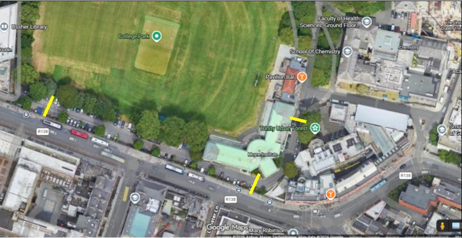 Parking restrictions will be in place adjacent to the Moyne and Parsons buildings in support of these works. Please see the map below for locations of these restrictions, indicated by the yellow lines.
