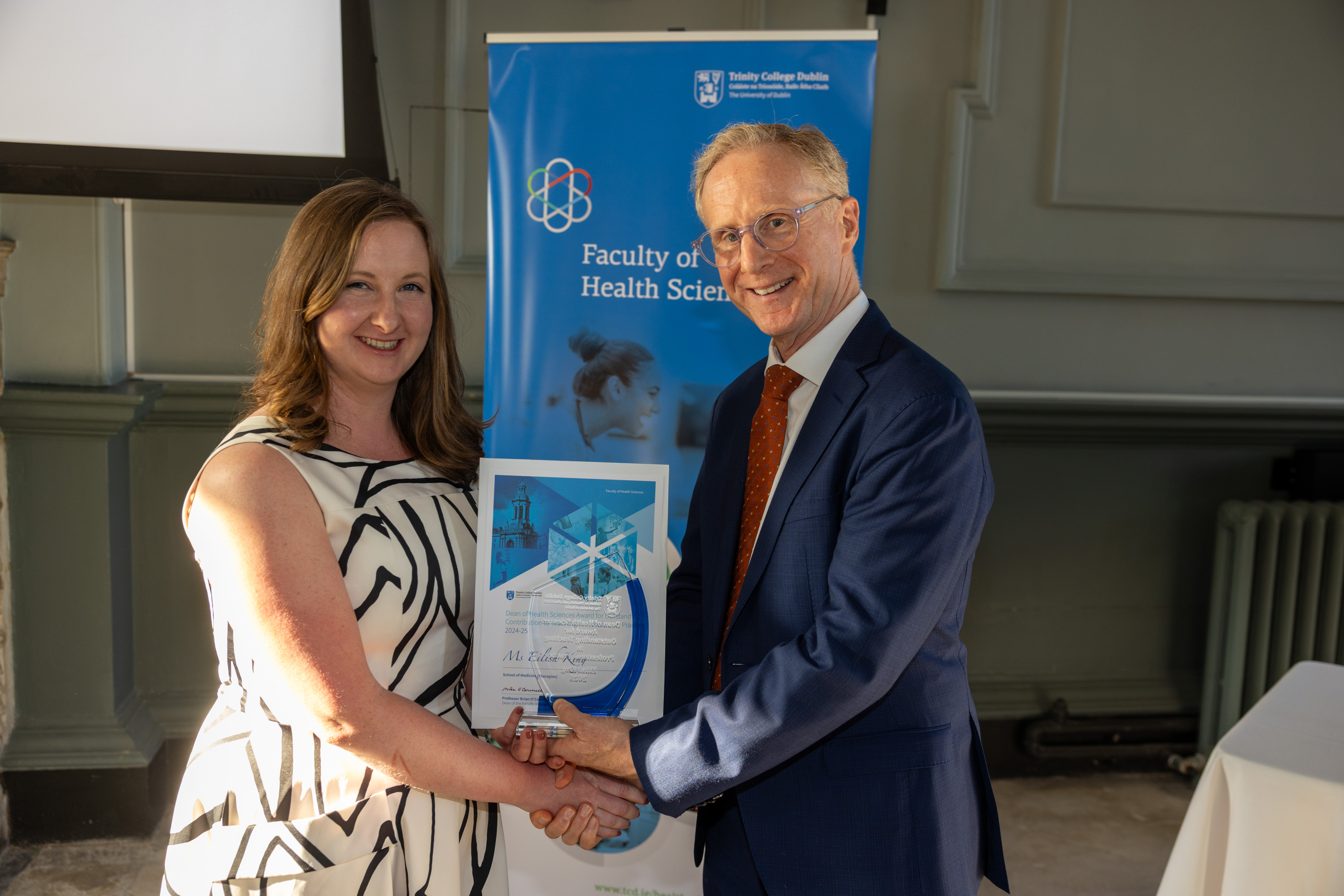 In 2017-18 the Faculty of Health Sciences announced its inaugural Dean of Health Sciences Award for Outstanding Contribution to Teaching in Professional Practice. This award was developed to recognise the significant contribution of professionals who do not hold appointments with Trinity to the delivery of teaching to our undergraduate and postgraduate students. Each of the Schools within the Faculty of Health Sciences has a long tradition of working with our clinical and allied health colleagues to educate students across all of our programmes, ensuring that our graduates are career-ready from the moment of graduation. This award seeks to recognise the valuable contribution of such colleagues and to highlight those exceptional individuals who excel in teaching and who continually encourage an ethos of excellence in clinical teaching.