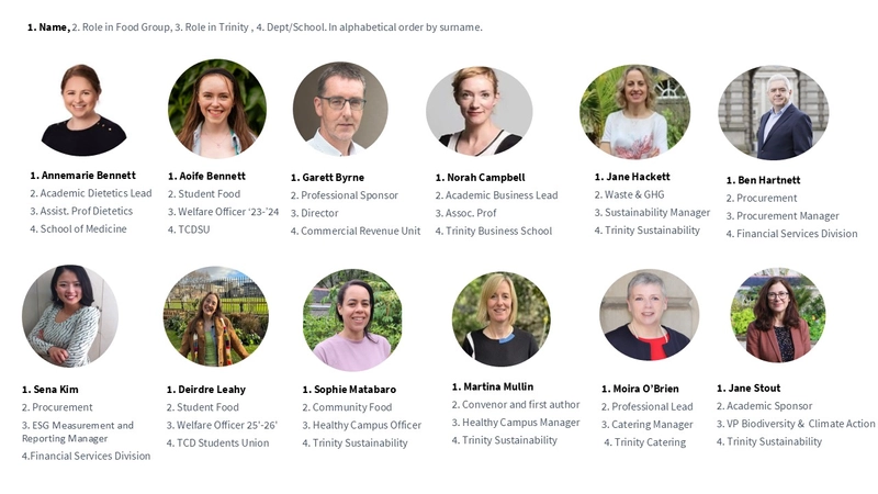 The Healthy Trinity: Healthy Eating group is lead by Prof. Annemarie Bennett from the Unit of Dietetics in the School of Medicine and Moira O'Brien, Head of Catering in Trinity. The Group is comprised of Academic staff, Professional Staff, and Student Reps.