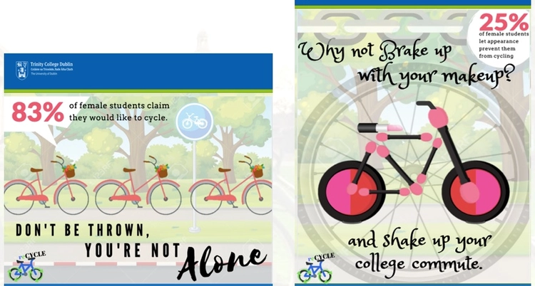 Dr. Sarah Browne facilitated Healthy Trinity's work by asking her Social Marketing (not social media) postgraduates on the MSc. Marketing programme in the School of Business to create initiatives to address health issues across seven health areas, one of which was Smarter Travel. Four groups created created initiatives for cycling.