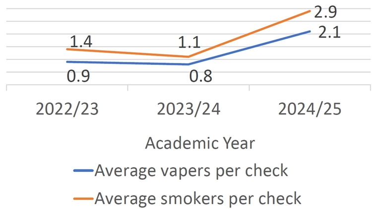 Vaping observed on campus (right) as part of Tobacco Free Trinity's Livng Lab found an increase from 0.9 vapers per check (609 checks) in 2022/2023 to 2.1 vapers per check in 2024/2025 (350 checks). In 2024/2025, 1,749 nicotine users were observed on campus, with 42% (n=728) using e-cigarettes. 59% of vapers (n=430) were using disposable vapes.