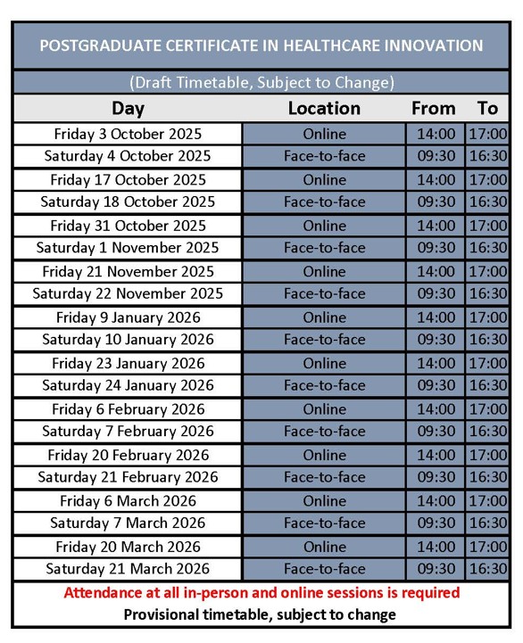 | Sample Timetable | Delivered over 10 teaching weeks. Fridays (online): 14:00–17:00; Saturdays (in-person): 09:30–16:30. |