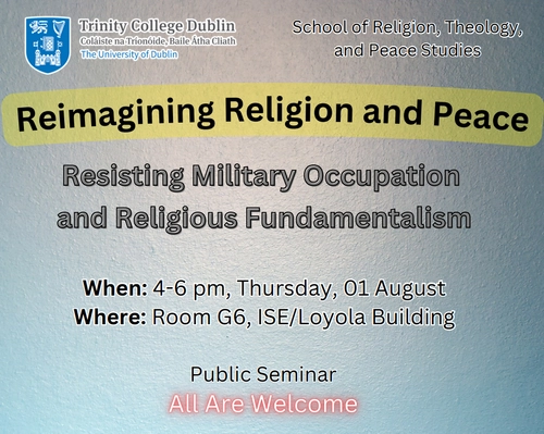 All are welcome to a public seminar organised by the Irish School of Ecumenics: ‘Reimagining Religion and Peace: resisting military occupation and religious fundamentalism’, on Thursday 1st August, 4-6pm in G6, ISE...