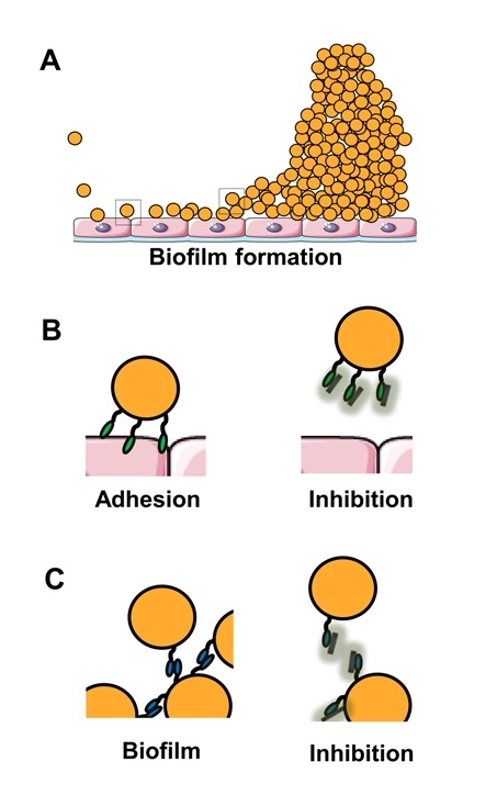 A) The bacteria (gold) attach to a surface inside the body (such as human cells, shown here) during the initial stages of infection. Once they attach, the bacteria begin to grow and link together. They build large accumulations of bacteria known as biofilms. Precisely targeting the binding sites on bacterial proteins can prevent attachment to the host surface (B) or prevent linkages from forming during biofilm formation (C).