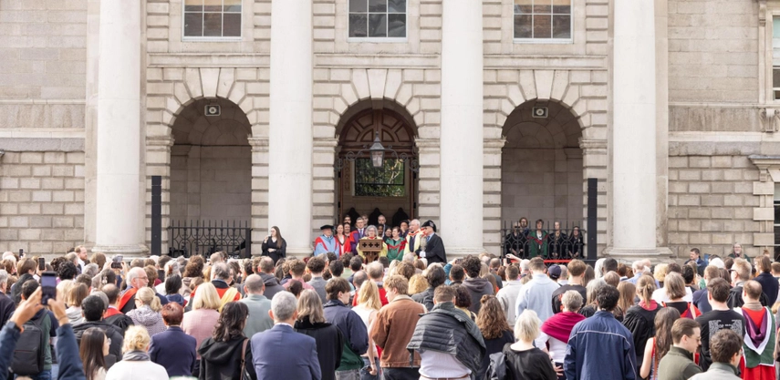 Screams of joy could be heard in pockets throughout the crowd as the Provost read the names of the new Fellows and Scholars from the steps of the Public Theatre, surrounded by members of Board. Among this year’s Fellows was John Bosco, the Director of Trinity’s Centre for Deaf Studies, and Trinity’s first Fellow who is deaf.