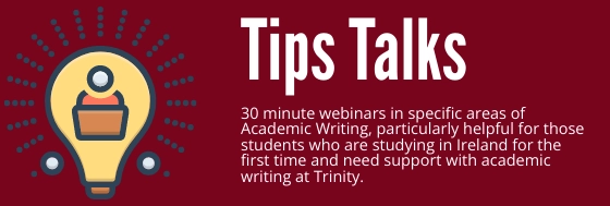 "Tips Talks" is a series of 30 minute webinars in specific areas of Academic Writing. These short workshops are appropriate for all students, undergraduate or postgraduate. They are particularly helpful for those students who are studying in Ireland for the first time and need support with academic writing at Trinity.