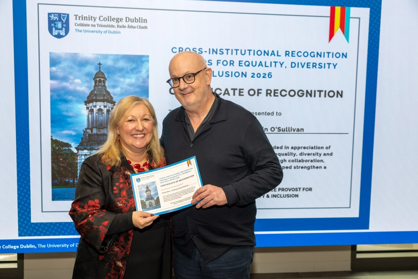 Congratulations to our School colleague and Senior Dean Prof Eoin O'Sullivan who was awarded a Certificate of Recognition at the 'Thriving at Trinity - Celebrating EDI' event. The award was presented by Prof Lorrain Leeson, who recognised that the portfolio of responsibilities of the Senior Dean are central to fairness, transparency, and ethical practice at the university, and align closely with the principles of equality, dignity, and fair treatment that underpin EDI. Eoin also leads The Trinity Legacies Review Working Group, a role Prof Leeson advised demonstrates his commitment to stewardship, accountability, and inclusive institutional reflection. Prof Leeson stated "He (Eoin) is a steady hand in what could be turbulent waters and he exudes calmness and fairness in all he does"