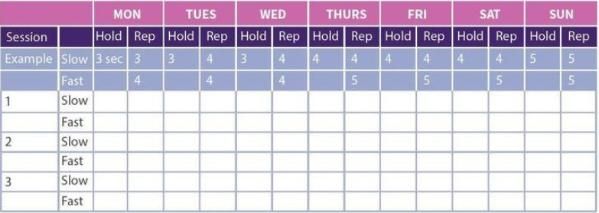 - For the slow squeeze, you can fill in how long you could hold your PFMEs and how many repetitions (reps) you can do.